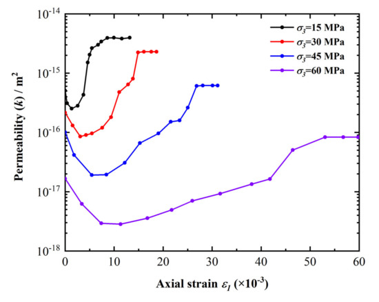 - In the gas–solid coupling experiment, with the increase in confining pressure, the maximum permeability in the whole loading process gradually decreases. The maximum permeability under confining pressure of 15 MPa is 3.96 × 10−15 m2, while the maximum permeability under confining pressure of 30, 45, and 60 MPa is reduced to 2.29 × 10−15, 0.618 × 10−15, and 0.083 × 10−15 m2, respectively. This means that high confining pressure will inhibit the permeability of dolomite under critical confining pressure, which is consistent with the law obtained under hydrostatic confining pressure;