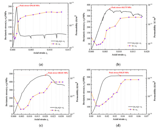 - During the axial loading process, permeability tests were carried out at different strain points, and at least 12 penetration tests were conducted during the whole loading process, including no fewer than eight times before the peak value, one time at the peak stress point and no fewer than three times after the peak value.