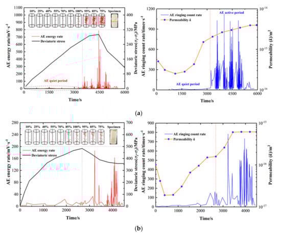 - Guo, J.; Zou, Y.; Cheng, X. Study on acoustic emission characteristics and permeability variation of coal samples under cyclic loading. Chin. J. Coal Sci. Technol. 2018, 46, 105–109. [Google Scholar] [CrossRef]