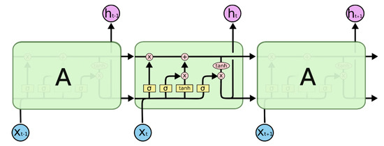 The LSTM network is a special recurrent neural network proposed by Hochreiter and Schmidhuber in 1997 [23]. It improves and perfects the loop body repeated in a chain in the conventional RNN. By adding a forget gate layer, an input gate layer, and an output gate layer in the network cell, continuous write, read, and reset operations on memory cells can be performed [24]. This enables LSTM to have long-term learning capabilities, and effectively solves the problems of gradient vanishing and gradient exploding, making it one of the most successful RNN networks. Figure 2 shows the basic network structure of LSTM, while Figure 3 shows the structure of an LSTM neuron.