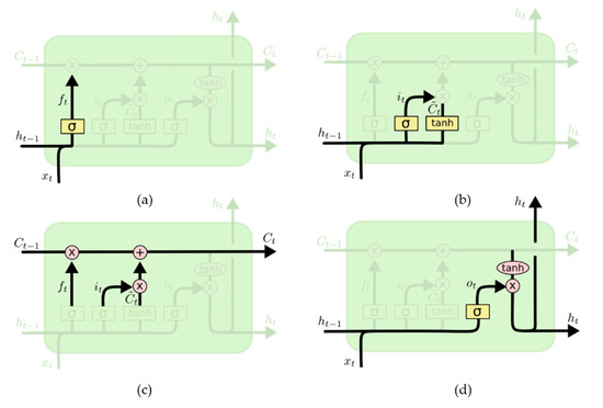 The structure of an LSTM neuron [22]: (a) the forget gate layer, (b) the input gate layer, (c) the cell status, and (d) the output gate layer.