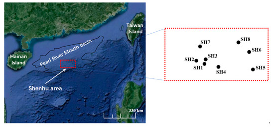 The Shenhu area is in the Pearl River Mouth Basin, in the middle of the northern slope of the South China Sea (Figure 4), and it is a key area for gas hydrate exploration. The water depth is 500–1500 m, the seabed topography is complicated, and the topographic slope varies greatly [25]. Since the late Miocene, with its gravity flow having developed and its high deposition rate, several kilometers of Mesozoic and Cenozoic sediments have accumulated to form enough organic matter to provide a source for gas hydrates [26]. In previous geological surveys of the area, many geophysical and geochemical markers indicating the existence of gas hydrates were discovered. In 2007, the Guangzhou Marine Geological Survey conducted the first gas hydrate drilling expedition in this area, and successfully drilled gas hydrate samples.