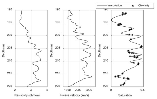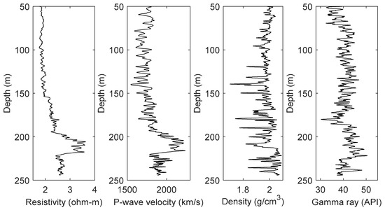 Figure 5 shows the well logs of site SH2. The cores at this site confirmed that the gas hydrate-bearing sediments were in the range of 190–220 m, and the hydrate saturation could reach 47.3% [27].