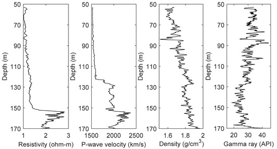 In the well logs of site SH2, the resistivity and acoustic velocity in the gas hydrate-bearing formations showed apparent high value anomalies, while the density and gamma showed no obvious changes. The well logs of site SH7 (Figure 6) showed that the depth of the gas hydrate-bearing formation was approximately 152–177 m, and the hydrate saturation could reach 43% [27]. The well log characteristics of the gas hydrate-bearing formation at site SH7 were completely consistent with those at site SH2.