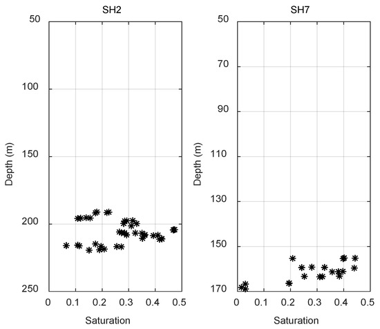 Because the chloride concentration of the formation pore water was relatively less disturbed, and the chloride concentration measured by the cores was more accurate, the gas hydrate saturation calculated by the pore water chloride concentration had a higher accuracy [28]. Figure 7 shows the gas hydrate saturations calculated by using the chloride concentration measured by cores in the gas hydrate-bearing formation at sites SH2 and SH7. There were 41 gas hydrate-bearing cores at site SH2, and 21 cores containing gas hydrate at site SH7 [3,29].