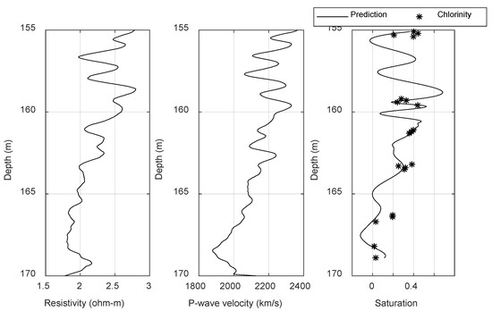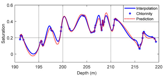 We selected the resistivity and acoustic velocity logs of 155–167 m at site SH7, standardized the data, and input the data into the previously trained LSTM recurrent neural network to obtain the prediction of the gas hydrate saturation (Figure 11). The black curve in Figure 11 shows the predicted value, and the black asterisks show the gas hydrate saturations calculated by the chloride concentration of the pore water at site SH7. The overall change trend of the predicted value of gas hydrate saturation obtained by the LSTM recurrent neural network was reasonable, and the prediction was basically consistent with the 21 measured values of site SH7. We picked out the corresponding 21 predicted values of gas hydrate saturation, and calculated the correlation coefficient and root mean square error between the predicted value and the true value. We obtained 0.7085 and 0.1208. We therefore achieved a relatively accurate prediction of gas hydrate saturation using the LSTM recurrent neural network.