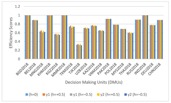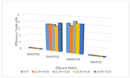 Now, we analyze the results of four efficient countries, namely, Bangladesh (BGD), Cambodia (KHM), Myanmar (MMR), and India (IND). Each good output ( or ) is increased individually (one at a time) by 0.5 unit; the excessive CO2 is either reduced or remains the same. Even if there is an increase in the already bloated bad output, it still does not take the DMU (i.e., Myanmar “MMR”) off the efficient frontier due to the selection of the feasible trade-off margins (h = +0.5, −0.5); see Figure 1.