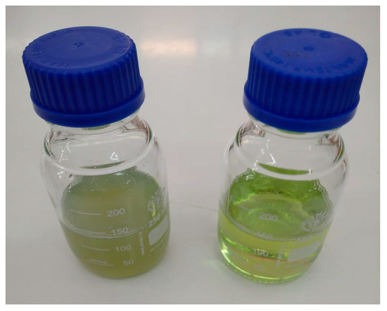 In order to avoid the agglomeration of NPs, which diminishes their beneficial effects on dielectric strength [1,7,32,33], each mixture was subjected to ultrasonication and vigorous magnetic stirring to achieve good dispersion of the NPs and homogenization of the final NF samples. In fact, each sample was sonicated for 30 min with the assistance of a Raypa UCI-50 ultrasonic bath, followed by a 15 min stirring with the use of a Biosan MSH-300 magnetic stirrer. The maximum input power of the sonicator is about 300 W with a frequency of 35 kHz. Each NF sample was subjected to ultrasonication under full power and the amount of ultrasonication energy was in the range of 540 kJ. This cycle was repeated three times for both NF samples, ensuring uniform dispersion of the colloidal suspensions, as indicated in [7]. Table 2 depicts the labeling of the NF samples, as well as the base oil, which will be submitted in the same experiments as well, while images of the two NF samples are shown in Figure 1 immediately after their preparation.
