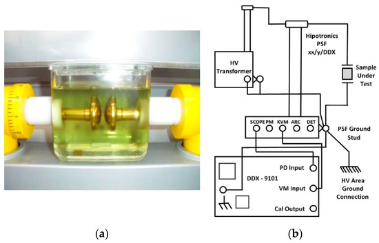 AC BDV and PD apparatuses: (a) BAUR DTA test cell with Rogowski electrodes. (b) Schematic diagram of the PD setup.