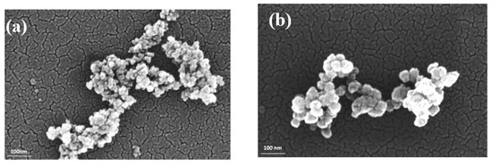 Field emission scanning electron microscopy (FE-SEM) was used to study the particle size and particle size distribution of the dry powders. The NPs were drop-casted by ethanol dispersion onto Si substrates. Figure 3 illustrates typical images of the Al2O3 Figure 3a and SiC particles Figure 3b at high magnifications. For both samples, the particles seem agglomerated, as it typically occurs when particles are drop casted from a dispersion to the substrate. The images reveal that the particles sizes have the nominal values, being, in particular, ~45–50 nm in the case of SiC and in the range 30–35 for Al2O3. For both materials, image analysis over broader areas by FE-SEM, incorporating a larger number of primary particles, show very narrow particle size distributions.