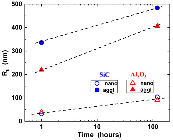 The evolution of Rh against time show that a weak agglomeration, in relation to TiO2-based oil dispersion [7] takes place. Both the primary particles (nano) and their agglomerates (aggl) exhibit an increase in size following similar rates among the two types of NPs. These findings demonstrate that the proclivity toward agglomeration of SiC and Al2O3 is rather weak, e.g., compared to TiO2 NFs. This finding lends support to the accuracy of the electrical characterization, considering that possible fast agglomeration process may affect the accurate monitoring of electrical parameters.
