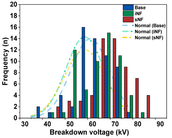 The breakdown voltages at 1, 10, and 50% probability levels of base, iNF and sNF (Table 5) were calculated from the probability density plots for both distributions, which are demonstrated in Figure 7. The choice of these probability levels corresponds to their importance for the operation of the transformer. On the one hand, U50% gives an assessment for the expected breakdown voltage, while on the other hand, U10% represents an indication on the initiation threshold of ionization, and therefore assists in concluding about the reliability of the transformer oil sample [7,23,32,33,34,35]. Last but not least, the BDV at 1% cumulative probability is necessary information for the designing of electric equipment. U1% corresponds to the limit of voltage for safety and continuous operation of the appliance [37].
