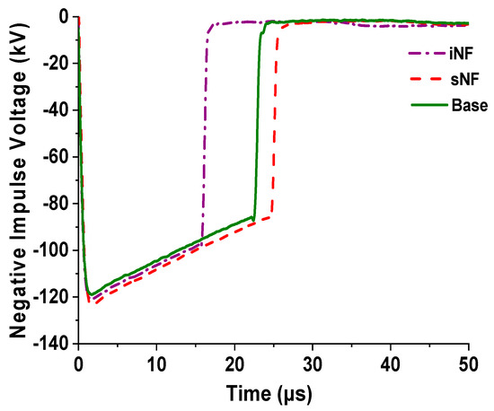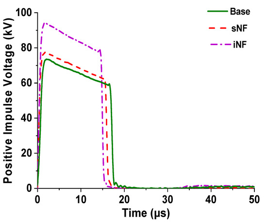 The up-and-down method was implemented in order to estimate the mean LI BDV under positive and negative polarity of base oil and the two NF samples after conducting measurements in various voltage levels according to the demands of IEC 60,897 standard. The mean LI BDVs as well as the average times to breakdown are exhibited in Table 6. Figure 8 and Figure 9 depict the oscillograms of the LI BDVs at 50% breakdown probability under positive and negative polarity, respectively.