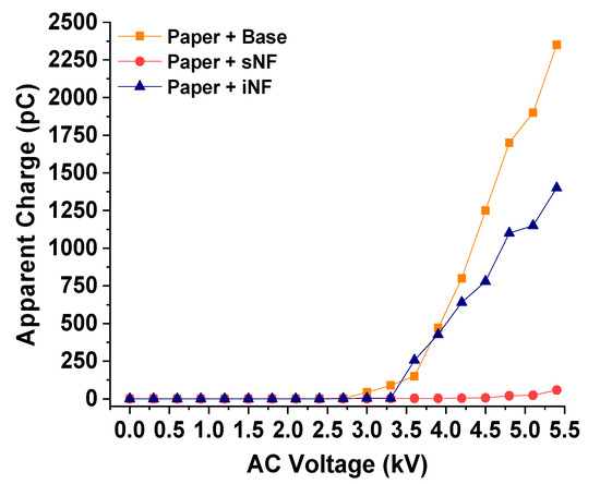 In Figure 10, the change in apparent charge is depicted versus the applied AC voltage, while the PDIV and the value of apparent charge at the PDIV for each sample are presented in Table 7. It is evident that all the samples in question have similar behavior until about the level of 3 kV. Above this voltage level, only the paper impregnated to sNF demonstrates a stable resistance to PD activity for the whole range of AC stress, with the accumulation of apparent charge at the level of 5.5 kV (highest applied voltage) being improved by 97.5 and 95.8% in comparison to the corresponding one of the paper impregnated to base oil and iNF, respectively. Papers impregnated to sNF and iNF samples demonstrate improved resistance to PD appearance by 92 and 44% with respect to the paper impregnated to the matrix.