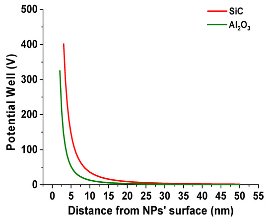 Substituting the values of conductivity and permittivity of FR3TM, SiC and Al2O3 NPs, as well as the corresponding values of mean dielectric strength and radius of NPs in Equations (3) and (4), the potential well of the colloidal suspensions of SiC and Al2O3 is given as:
