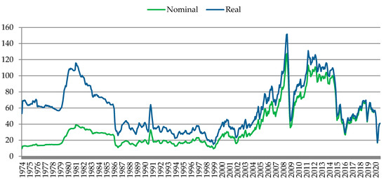 There were some significant spikes in the price of oil. The first was noticed in May 1974, followed by the Yom-Kippur War in 1973, when imported crude oil’s actual price per barrel jumped to 69.64 USD, followed by January 1981, just after the Iranian Revolution in 1979, with the price per barrel hitting 115.81 USD. The central peak during the considered period coincided with the time of the world’s financial crisis in 2007 and 2008. Further, in March 2012, another peak was observed when real prices increased up to 126.10 USD per barrel (Figure 1).