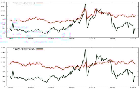 This paper aims to indicate the linkages between crude oil prices and selected food price indexes (dairy, meat, oils, cereals, and sugar) and provide an empirical specification of the direction of the impact. This paper reviews the fuel–food price linkage models with consideration to the time series literature. This study adopts several methods, namely the Augmented Dickey–Fuller test, Granger causality test, the cointegration test, the vector autoregression model, and the vector error correction model, for studying the price transmission among the crude oil and five selected food groups. The data series covers the period between January 1990 and September 2020. The empirical results from the paper indicate that there are long-term relationships between crude oil and meat prices. The linkage of crude oil prices occurred with food, cereal, and oil prices in the short term. Furthermore, the linkages between the analyzed variables increased in 2006–2020.