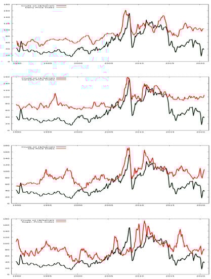 The second explanation may be related to the usage of some groups of agricultural commodities for biofuel production. There has been an important rate change between fuel and food when the Renewable Fuel Standard was enacted in 2005 in the US. Hence, there are noticeably stronger linkages between crude oil prices and volatility in food commodities, which are closely related to biofuel production. These relationships were confirmed by researchers in former studies (e.g., Coronado et al. [51]; Vacha et al. [52]). In March 2020, the price index was lower than in February. However, the decline was not the result, as might be expected, of the fall in demand due to the coronavirus lockdown but the oil price slump. A significant part of the world’s crops, e.g., sugar cane in Brazil, maize in the USA, or rape in Poland, is intended for the production of biofuel as an alternative energy source. Therefore, when the crude oil prices fell sharply in the world’s markets, biofuel producers also had to adjust their prices. Our results confirm the short-run relationship between the price of crude oil and the prices of cereals and oils.