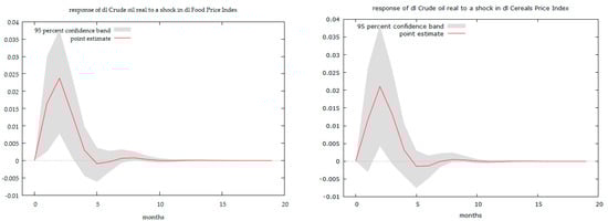The results indicate that crude oil price does not have a short-term impact on food, dairy, cereal, oil, and sugar price volatility in the second subperiod; however, food, cereal, and oil prices have a favorable short-term impact on crude oil price volatility. Further proof of the short-run connection between analyzed prices can be inferred from the IRF test. Figure 3 presents only statistically significant impulse responses. The reaction of the price of crude oil to the food, cereal, and oil price is positive. The change in impact occurs after the fourth month for oils and the fifth month for food and cereals.