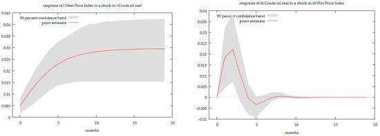 Because there is one cointegrating rank in the relationship between meat and crude oil prices in the second subperiod, the VECM model was used. The result estimation is presented in Table A2 in the Appendix A. The coefficient in the long-term linkage in the VECM model (with the restricted trend and unrestricted constant) is 6.16, which means that a 1% increase or decrease in crude oil price is a response to a 6.16% increase or decrease in meat prices. Therefore, the price of crude oil is an exogenous variable for meat prices. This is evidenced by the significant EC coefficient in the meat price equation. The coefficient for the error correction term in the meat price equation is 0.027, whereas for the crude oil price, the equation is −0.008. Therefore, the disequilibrium in the price system is revised in one month by 2.7% via the reaction of the meat and by 0.8% via the reaction of crude oil. Moreover, the meat price response is positive and persistent throughout the entire period (Figure 3).