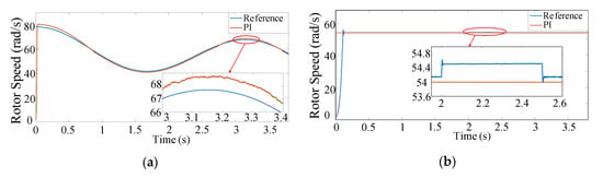 In the classical control scheme, the conventional PI controller can be applied into the speed loop control and current loop control of the generator. Figure 2 shows the rotor speed responses to the rotor speed reference calculated by Equation (7) under different disturbances. It can be seen that the conventional PI controller is unable to keep on tracking the reference value, with an overshoot of about 1 rad/s at the peak marine current, and the rotor speed changes when a sudden turbine torque of 10 Nm is added at 2 s–2.5 s. Controller parameter tuning usually requires accurate plant model and parameters, which may be unavailable or present uncertainties under different operation conditions. This leads to challenges of stable tracking under marine current variation, turbine torque disturbance and uncertain parameters.