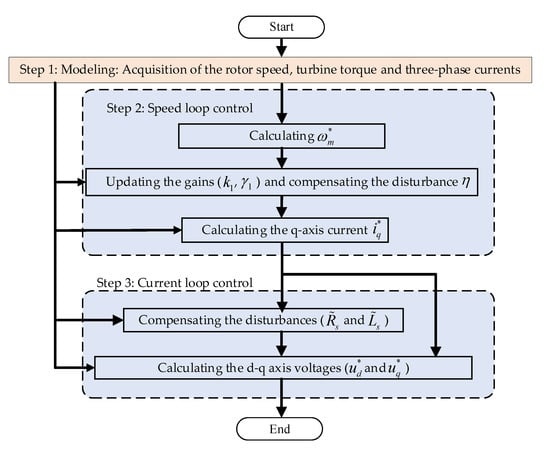 - Current loop control: the tracking errors (, ) and the d-q axis current are calculated to update the compensations (, ) for uncertain parameters then the derivative of the reference voltages (, ) is computed based on the A-BC method.