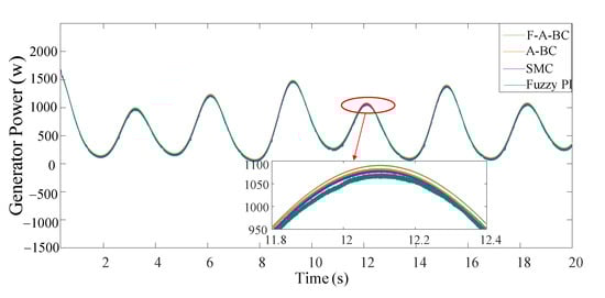 Figure 8a shows the generator rotor speed under torque disturbance. During the disturbance stage (1–1.5 s), there are rotor speed fluctuation phenomena for the SMC and fuzzy PI controllers. The SMC and A-BC controllers can reduce overshoot under disturbance condition and can recover quickly after disturbance is removed, compared with the fuzzy PI. It can be observed from Figure 8b that the proposed F-A-BC controller is insensitive to the torque disturbance and can always track the optimal rotor speed with no overshoot. Table 3 compares the dynamic performance of rotor speed under swell effect and torque disturbance by different controllers, which is calculated by ISE (integral of the square error) expressed by Equation (30). A smaller ISE value means it has better ability to suppress error [34].