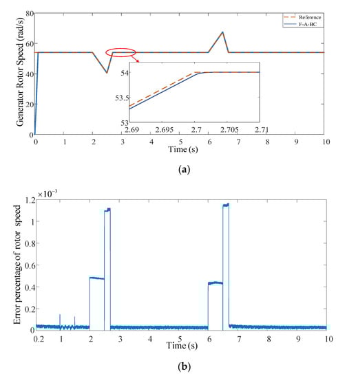 Figure 7a shows the generator speed response to the speed reference calculated by the MPPT strategy based on TSR under marine current and turbine torque disturbance. At first, the marine current velocity is a constant value (2 m/s) and the rotor speed can rapidly follow the optimal value (54 rad/s) with little overshoot. Then, an additional torque disturbance is added into turbine at 1.5 s–2 s. It can be observed from Figure 7b that the turbine mechanical torque disturbance has little influence on rotor speed response and the maximum error percentage is less than 0.02% of the steady-state speed of 54 rad/s. During the abrupt change in marine current velocity at 2–2.7 s and 6–6.7 s, the proposed F-A-BC controller can smoothly track the optimal reference and the rotor speed error is in the range of 0.05% to 0.12% as shown in Figure 7b. When the marine current speed recovers to the constant value at 2.7 s, the proposed method can rapidly track the optimal rotor speed (54 rad/s) within 0.001 s, which proves that the proposed controller is robust against disturbances and has fast convergence.