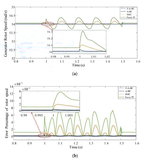 Figure 5a,b shows and compares the generator rotor speed response and error percentage under swell effect by different control strategies. It is worth noting that the fuzzy PI controller has a relatively large fluctuation and results in an overshoot of about 2.1 rad/s at a high velocity of marine current, which is 3.4% of the reference rotor speed. The SMC method has a chattering phenomenon near the reference rotor speed, and the error percentage is in the range of 0.5% to 1%, although it can reduce the overshoot. The A-BC method can smooth the rotor speed with an overshoot of 0.25 rad/s at the peak marine current speed. However, the rotor speed disturbance still exists and gradually increases with the marine current velocity. It can be observed from Figure 5b that the proposed F-ABC approach can track the optimal rotor speed and reduce the rotor speed error to less than 0.1% when marine current increases and decreases.
