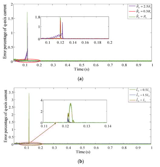 The error percentage of q-axis current under different stator resistances and inductances. (a) The error percentage of current under different resistances; (b) the error percentage of current under different inductances.