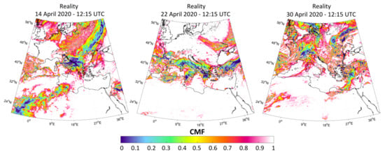 The cloud modification factor (CMF) for 14, 22 and 30 April 2020 at 12:15 UTC, as calculated by the fast radiative transfer models (FRTM) using as input the Meteosat second generation (MSG) cloud optical thickness (COT).