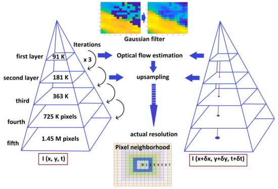 Optical flow is the apparent motion of objects between consecutive frames, caused by the relative movement between the object and camera. Onto the two-dimensional image plane, the optical flow displacement vectors can be considered as the projection of real three-dimensional motion vectors of an object []. The problem of optical flow estimation is outlined as the approximation of the motion field from image intensity variations with time, solely attributed to objects displacement. A number of different approaches to motion estimation have been proposed through the years, and in the context of the current study, the gradient-based approaches of optical flow estimation [] are utilized. The starting point for optical flow estimation is that the image intensity I(x,y,t) satisfies the following equation: