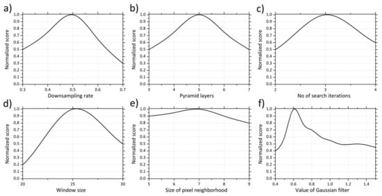 Figure 2 illustrates the FRB flowchart adapted to the specific parameters used in this study. Starting from the 1.45 million pixels images, the pyramid layers were set to 5 with a downsampling rate of 0.5 (i.e., each upper layer is twice smaller as the previous one) and a number of iterations equal to 3 in order to achieve the convergence of the pyramid layers transition to the final actual resolution image. Simultaneously, the window size was set to 25 since the optimum value should be large enough in order to have sufficient intensity variation and at the same time as small as to contain only pixels with about the same disparity. Finally, the size of the pixel neighborhood was set to 7 for smoother image surfaces and the standard deviation of the Gaussian filter to 0.6. The determination of the optimum parameterization for this study is shown in Figure 3, which highlights the contribution of the parameters to the optimum combination in terms of the normalized score, which is described as (Xmax − X)/(Xmax − Xmin), where X represents each parameter value before the normalization, and the Xmax and Xmin are the maximum and minimum values of the range of the parameter, respectively.