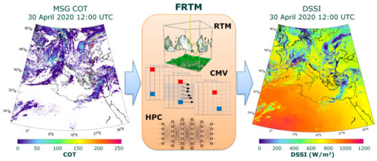 For the FRTM, we used a novel model that is able to use operational and in real-time atmospheric inputs from earth observation (EO) data sources, like the COT from the MSG/SEVIRI applied in this study, and to produce massive DSSI outputs in high spatial, temporal and spectral resolutions of the order of 5 km, 15 min and 1 nm, respectively, as described in []. It uses a synergy of precalculated lookup tables (LUT) simulated by the libRadtran library of RTM [], CMV algorithm as described in the previous Section 2.2 and high-performance computing (HPC) for parallel runs. Using a 32 core CPU supercomputer with 256 Gb RAM, the whole procedure (20 million simulations) runs for 1 min and 40 s, creating 12 high-resolution (1.5 million pixels) maps for the following 3 h. Figure 4 illustrates the data flow between the input used in this study to the FRTM and the DSSI output for 30 April 2020 at 12:00 UTC. A web service demonstration of the FRTM for the European and North African domains can be found online [].