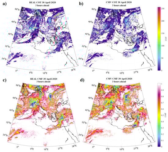 The real (a) and the FRB forecasted (b) COT map for 30 April 2020 at 12:15 UTC, as well as the corresponding real (c) and FRB forecasted (d) CMF maps for 3 h-ahead (12 time-step forecasts).