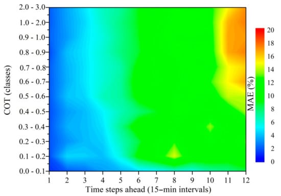 Contour plot of the FRB forecasted COT mean absolute error (MAE) percentage as a function of COT classes for 3 h ahead at 15 min intervals.
