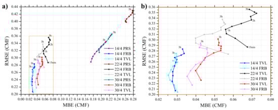 All statistics were calculated in terms of CMF to see the objective results, independently from solar elevation or other parameters like aerosols, etc., focusing only on the forecast cloud uncertainties and forecast horizon errors. A similar trend in error is seen from both FRB and TVL approaches for the 3-day analysis. However, FRB seems to produce slightly less error than the TVL method for all the days and all forecast horizons. The greatest difference is observed for 22 April 2020, during which FRB performs much better than the TVL approach for all forecast horizons, indicating the optimal performance of FRB under small-displacement conditions. This result is relatively different from the findings of [,] and must do with the optimization performed in this study to both CMV approaches. The TVL method has built-in smoothness terms that better handles cloud formation/dissipation, while FRB follows better multiple cloud layers with different directions and speeds. A similar evaluation approach was presented in [], highlighting the usefulness of such comparisons (i.e., RMSE vs. MBE) for analyzing the forecast horizon statistics and the overall score. As a result, the overall accuracy of both CMV methods is strongly related to the specific characteristics of the cloud patterns, making a long-term (e.g., one full year of forecasts) validation necessary for more robust conclusions. For the rest of the study, we will focus on the FRB method, which appears to have equal or better results for the selected test days and also the easiest procedure for improving the model parameters []. It should be highlighted that this selection could not be generalized since further analysis is needed in terms of comparison against ground-based measurements.