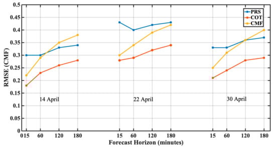 In Figure 8, we quantify the RMSE of CMF for pixels that changed from cloudy condition to clear sky and vice versa. The RMSE was calculated in terms of CMF for both cases of applying the FRB model to COT and CMF maps. The COT approach presents the lower error values for the 3 days, with the CMF approach to follow, and in some cases to be outperformed by the PRS at large forecast horizons, for example, at 2 and 3 h ahead of 14 April 2020 and at 3 h ahead of 30 April 2020. It is observed that the rate of increase in RMSE of CMF for PRS and COT is almost identical, while in the case of CMF, the rate is comparatively high. Surprisingly, both minimum and maximum RMSE values are observed in 15 min forecast as 0.18 for COT and 0.43 for PRS, respectively. The average RMSE of CMF is found to increase with forecast horizon as 0.28, 0.30, 0.34 and 0.36 for 15 min, 1 h, 2 h and 3 h forecasts, respectively.