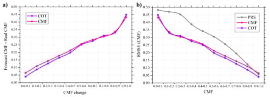In Figure 9a, a quantification of the overall forecast variability for all CMF changes was performed. The horizontal axis shows the CMF change over two consecutive images, and the vertical axis represents the mean absolute difference between the forecast and the real CMF for both CMV approaches. Both COT and CMF techniques present similar behavior indicating the expected differences across the CMF potential changes.
