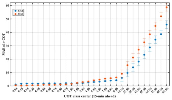 Classification of PRS and forecasted COT in terms of MAE ± 1σ for the 15 min forecast time horizon.