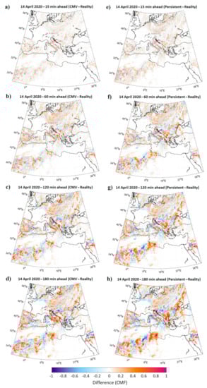 Difference between the CMV and the real CMF during 14 April 2020 at 15 min, 1, 2 and 3 h ((a–d), respectively) ahead time horizons, as well as the difference between the PRS and the real CMF for the same time horizons (e–h).