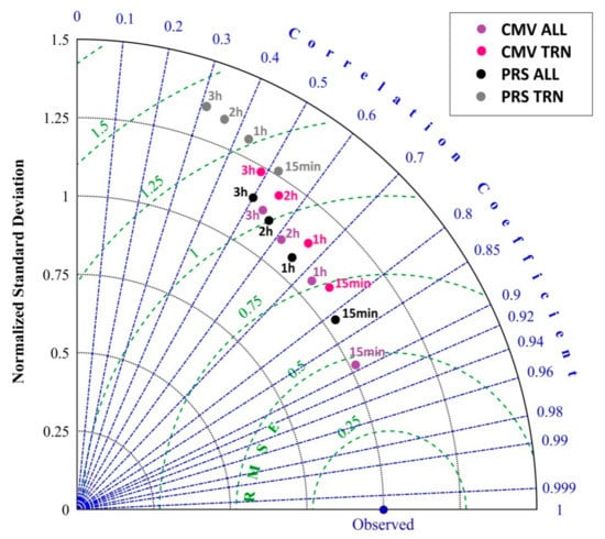 Under all conditions, the CMV shows the best results/statistics with a correlation coefficient (r) close to 0.9 and the normalized standard deviation almost 1 for the 15 min-ahead time horizon. The r decreases to 0.54 for the 3 h-ahead time horizon, while the PRS under the same evaluation conditions presents similar statistics as the forecast horizon grows (i.e., r = 0.5 for 3 h ahead). The limited ability of the PRS method was revealed during the TRNs. Indicatively, the lowest r (~0.5) of the CMV TRN which is at the 3 h-ahead time horizon is almost the starting point of the PRS TRN at the 15 min ahead, highlighting the overall value of the CMV against the PRS.