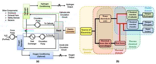 These reactions take place at the catalyst layer coated on each electrode. The diffusion layer on each side helps in efficient current distribution and also connects the Membrane Electrode Assembly (MEA) to the distribution plates. Distribution (bipolar) plates aid toward structural integrity of the cell. It also separates one cell from the other when cells are assembled together in the form of a stack to deliver the required hydrogen flow rate. In addition to the cell/stack, an electrolyser has auxiliary components to ensure the proper functioning of the stack. This includes power supply/voltage controller, input water conditioning system, water circulation system, water–gas separators for hydrogen side as well as oxygen side (optional), heat exchanger, controlled valves and safety devices. These components also consume energy and directly affect the performance and efficiency of the electrolyser. The general schematic of a PEM electrolyser is shown in Figure 2a. Depending on the size and specification of the electrolyser, one or more components may or may not be present in the configuration. Figure 2b shows various multi-physics phenomena involved in a PEM electrolysis cell. PEM electrolyser is a complex system that involves the non-linear relations to describe its dynamics due to coupling between various physical phenomena such as electro-chemical, thermo-electrochemical and thermo-fluidic.