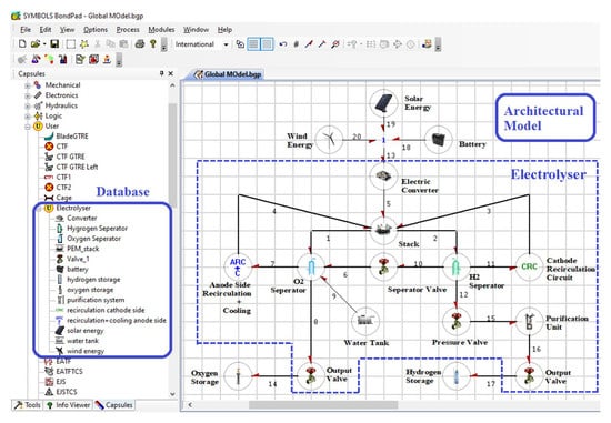 Depending upon the nature of interaction of the capsules with its environment, the ports can be defined as effort or flow input port and effort or flow output port. Based on the requirements these ports can be attributed as optional and hence are not needed to be connected in order to create the global model. Coupled energy interaction between the sub-models can be represented by a vector bond as shown by bond number 26 in Figure 5. A number of capsules are already available in the database of the software for the commonly used components such as tanks, valves, pipes, heaters and sensors. User defined capsules can be stored in the database and can be used and modified as per the model requirement. Figure 6 shows the user defined capsules, developed for the PEM electrolyser system.