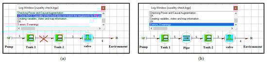 Using the capsules, a global model of a complex system can be assembled in the model builder of the Symbols Shakti software. Figure 6 shows the graphical user interface of the model builder. The global model is assembled in the form of piping and instrumentation diagrams using the capsules. For example, the architectural model of a PEM electrolyser is shown in Figure 6. The model builder also generates the behavioural equations for the whole system automatically. To successfully connect the capsules with each other there are certain rules that have to be respected. The connectivity of the capsules is automatically checked by the software for validity. Only the like ports can be connected. The flow (resp. effort) output of a capsule can only be connected to the flow (resp. effort) input of the other capsule and vice versa. For example, Figure 7 demonstrates the requirement of the coherence of causality for the connection of the capsules of two tanks. From Figure 7a, it can be seen that it is not possible to directly connect two tank capsules together as the input for the tank capsule is flow and the output is effort. In order to connect the two tank capsules the resistance of the pipe needs to be considered which takes effort as input and flow as output (as shown in Figure 7b). References [37,38,39] and the reference manual of the software can be referred to for further details.