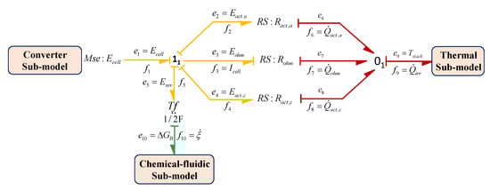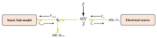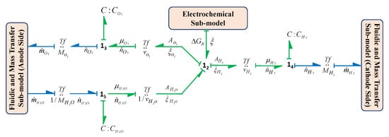 In this sub-model, is modelled as a modulated source of effort BG element, that is, and all the overpotentials are modelled by generalized coupled resistive elements as , and corresponding to anodic activation resistance, cathodic activation resistance and ohmic resistance, respectively. Here, the generalized coupled resistance element shows the coupled energy dynamics and links the electrical domain with the thermal domain. It acts as a source and transmits the generated heat or entropy to the thermal domain due to the current flow in electrical domain [26,43]. Also, the transformation of electrical energy into chemical energy and vice a versa is modelled by transformer generalized BG element, which describes the Faraday’s law by linking the rate of reaction flow () with the current flow through cell (), number of moles of electron transferred n (here ) and Faraday’s constant F; and, also by linking reversible cell voltage () with free energy of water dissociation , n and F, which are represented in Equations (3) and (4).