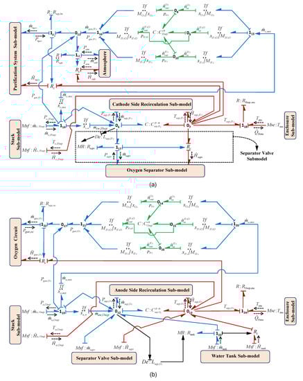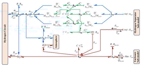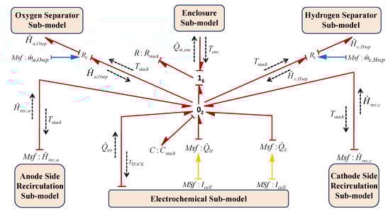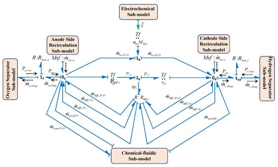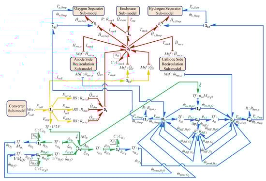 The schematic architecture of the PEM electrolyser and the physical variables exchanged between its subsystems are shown by the word BG presented in Figure 8. In Figure 8, line with half arrow represents the power bond, where yellow bonds show the electrical energy (current and voltage variables), red bonds show the thermal energy (heat flow and temperature variables), blue bonds show the fluidic energy (mass flow and pressure variables), green bonds show the thermal-fluidic energy coupling (heat flow, temperature and mass flow, pressure variables) towards hydrogen side. Likewise, orange bonds show the thermal-fluidic energy coupling towards the oxygen side.