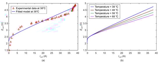 where is the ohmic overpotential. The ohmic resistance mainly includes the resistance offered by the membrane to ions flow and also includes the other ohmic resistance offered by the internal cell components except the membrane. Thus, is obtained from Equation (11) that depends upon the properties and parameters of the membrane , . represents the membrane conductivity, and , respectively, represent the length and cross-sectional area of the membrane. Moreover, the resistance can be obtained from the experiments using model fitting technique.