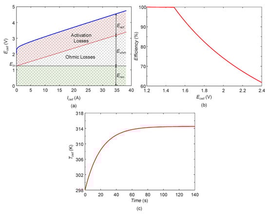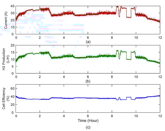 Thus, using Equation (10), the cell current can be derived from the electrochemical BG submodel by using constitutive relation for , which is used for controlling the hydrogen production by the cell. The required input cell voltage can also be derived by rearranging the Equation (16)