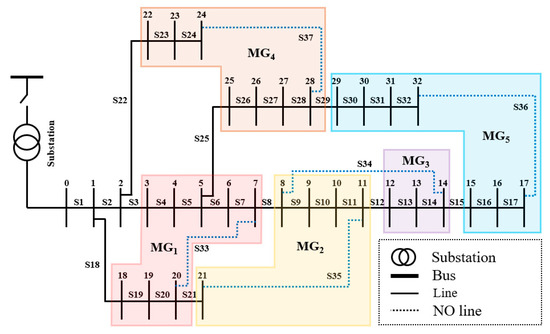 The simulations are prepared in a desktop computer installed with Microsoft Windows 10 Enterprise Edition as the operating system for coding and testing. The CPU of the computer is Intel Core (TM) i5-4660, equipped with an 8G Samsung DDR3-1600 as the memory. In terms of software, the Java NetBeans IDE 7.2 is adopted as a development tool to simulate the standard IEEE 33-bus RDS, which integrated with MGs deployed according to the loops. Figure 1 shows the schematic diagram of the test system. Since there are five loops in the standard IEEE 33-bus RDS, the test system maximizes the deployment of the hypothetical MGs in these loops to ensure that the MGs can generally work in the grid-connected mode and are also able to operate in the islanded mode under the specific conditions [32].